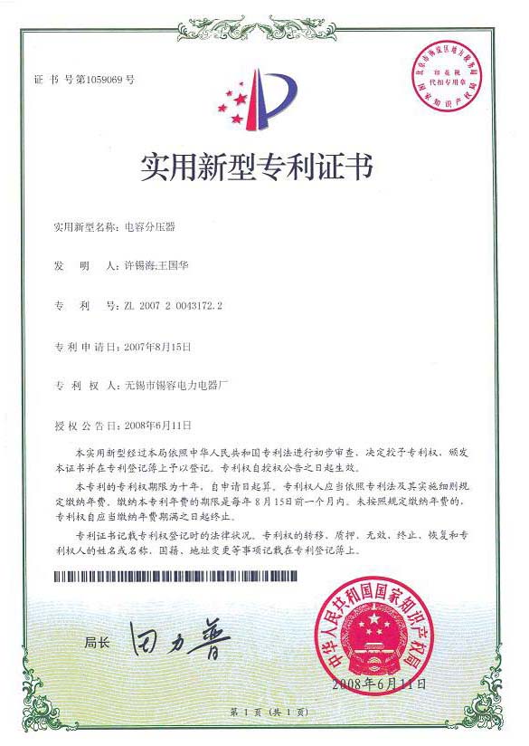 Utility model patent certificate release time:2020-07-20 04:23:27source:Wuxi Xirong Electric Appliance Co., Ltd.Click:1410